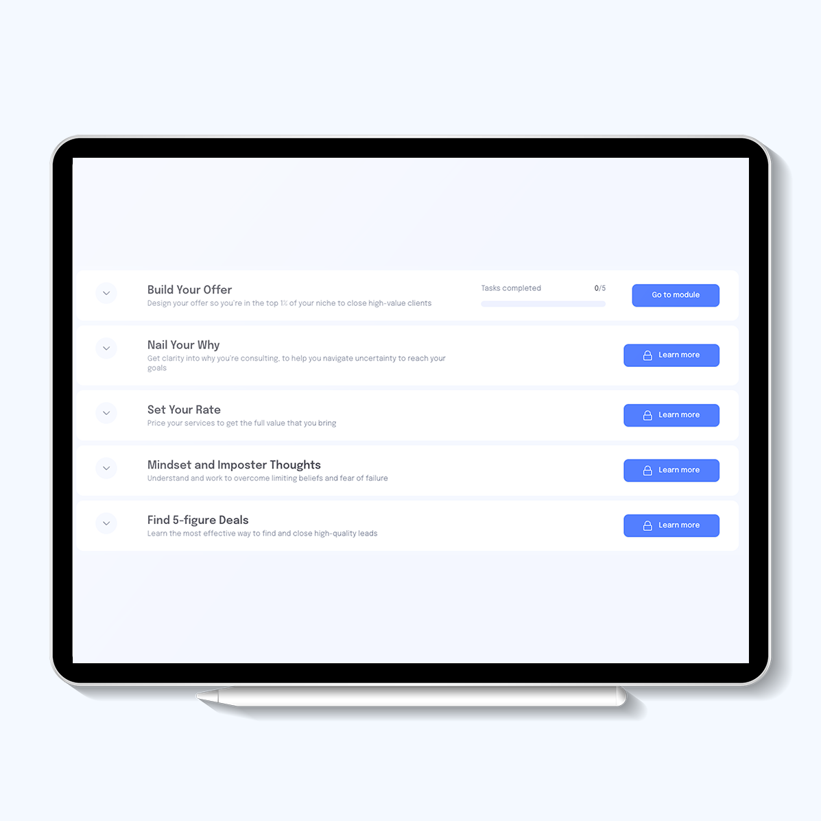 The Playbook contains 13 modules that cover how to build your offer, set your rate, work through imposter syndrome, create inbound leads, send a winning proposal, and more.